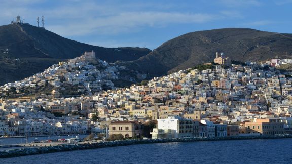 Wie ein riesiges Amphitheater stapeln sich die Häuser von Ermoupolis und Ano Syros den Berg hinauf. Diese Kulisse ist beeindruckend. Für viele Reisende ist dies jedoch der einzige Einblick in diese Insel. Denn sie sind mit der Fähre unterwegs zu den üblichen Touristeninseln. Syros kennen sie nur vom Vorbeifahren. Dabei hat diese Insel sehr viel zu bieten. Herrliche Sandstrände, reizvolle Wanderstrecken und ein üppiges Angebot an kulturellen Events. Nahe den malerischen Buchten und den schönen Sandstränden gibt es familiäre Unterkünfte anstatt Hotelburgen. Und insgesamt ist hier alles etwas ruhiger. In Ano Syros, der mittelalterlichen Festung, scheint die Zeit stehengeblieben zu sein. Keine Souvenirläden, keine plakative Werbung. Alles steht unter Denkmalschutz. Und überall ist der Geist von Markos Vamvakaris, der hier geboren wurde gegenwärtig. Keine Taverne, in der seine Rembetiko-Musik nicht zu hören ist.